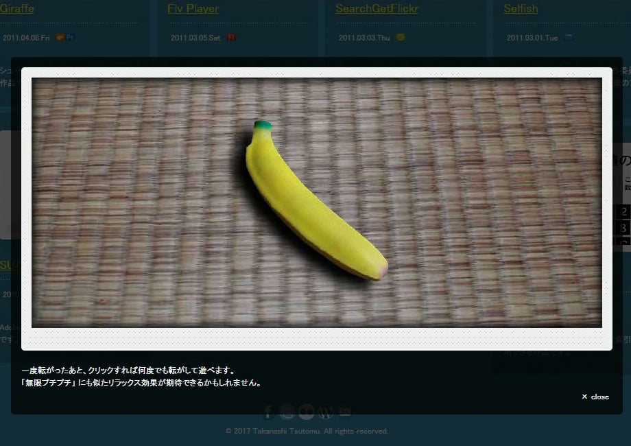 タタミの上のバナナを無限に転がせます。一度転がったあと、クリックすれば何度でも転がして遊べます。「無限プチプチ」 にも似たリラックス効果が期待できるかもしれません。