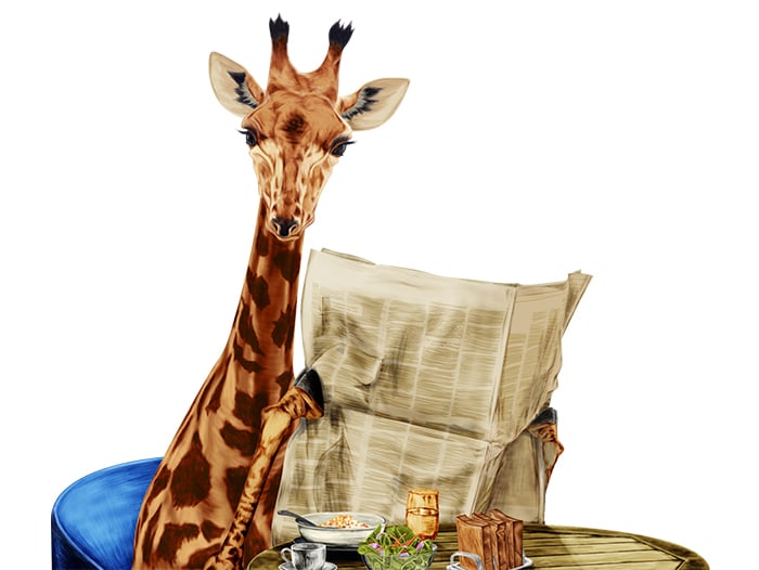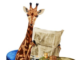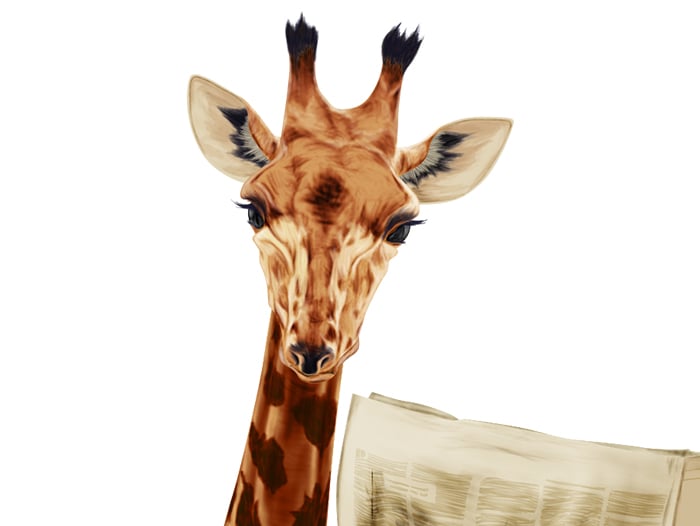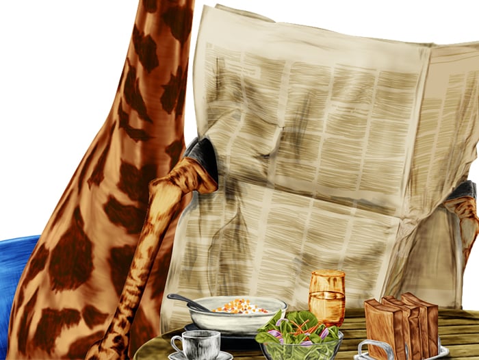シュールなキリンを描きたくなって描いた作品です。日常生活の一部をキリンに置き換えました。今後、背景も描く予定です。