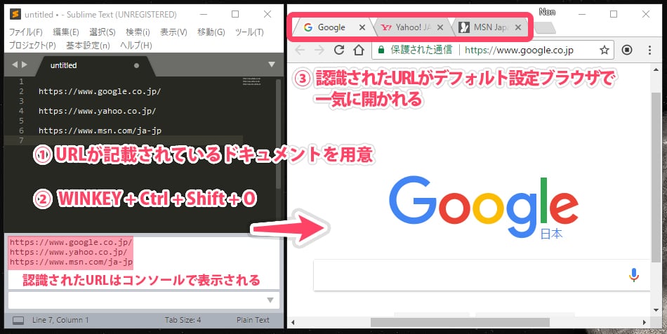 SublimeText3 でアクティブドキュメント内のURLを抽出してデフォルトブラウザで開く plugin です。実行ショートカットキーは「WINKEY + Ctrl + Shift + O」を設定しています。
